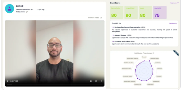 - Entrevistas inteligentes en video, pruebas, scoring de muestras.