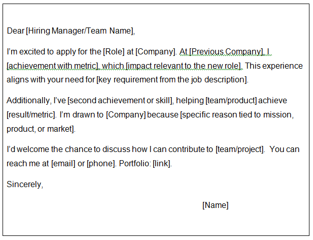 Call to action (CTA): Close with a clear next step. Whether you’re inviting a call, pointing to a portfolio, or requesting an interview, state what you’d like to happen after they read your letter.