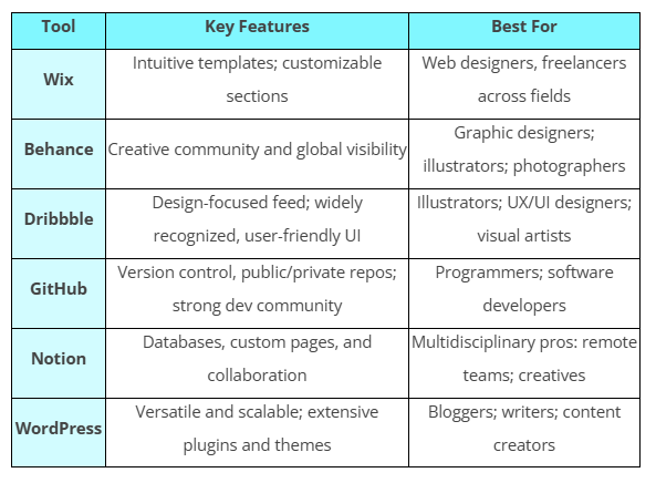 Every profession has its own canvas and brushes. A great portfolio doesn’t have to use the same palette as someone else’s. (Here, a brief comparison table of tool options—by profession or use case—can help readers choose the right platform.)