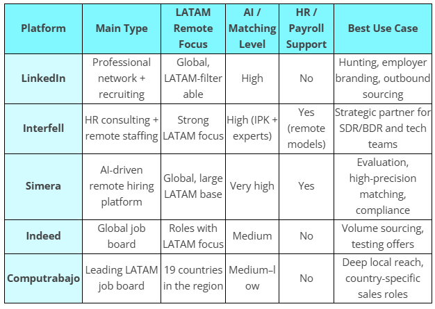 Use LinkedIn as a powerful source of talent hunting and employer branding, but avoid relying on it alone. Combine it with specialized partners like Interfell and Simera, who can handle deep filtering, assessment, and the legal/operational side of remote hiring in LATAM.