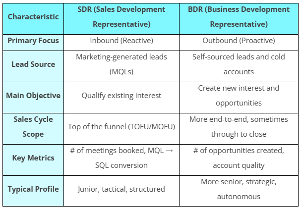 An SDR focuses on qualifying inbound marketing-qualified leads (MQLs) and booking meetings. A BDR creates new opportunities through outbound prospecting and account-based work. Both are essential to a complete demand generation strategy.