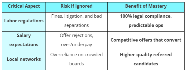 Leverage country-specific salary benchmarks and adjust for seniority, language, and contract type. Align benefits and perks to local norms and cost of living. Review compensation quarterly to stay competitive and retain talent. - Do I need bilingual recruiters?