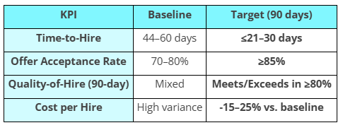 - Time-to-Hire (TTH): days to fill (target: ≤21 days for priority roles).