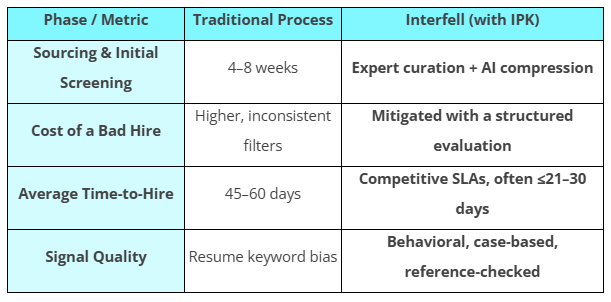 - Interfell Professional Key (IPK)—an AI evaluation engine by Simera—to assess technical fit, cultural add, and regional experience.