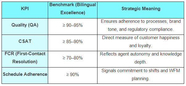 - Define must-have outcomes (QA ≥90%, CSAT ≥85%, FCR ≥70%).
