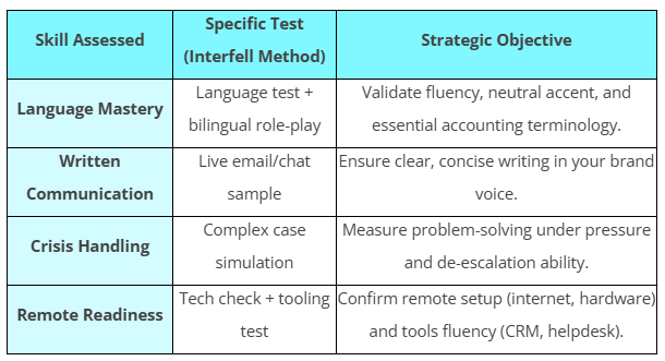- Assess language mastery, written clarity, crisis handling, and remote readiness.