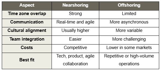 In simple terms, nearshoring brings talent closer to your company’s way of working. Offshoring typically lowers costs further, but it can also make collaboration more complex.