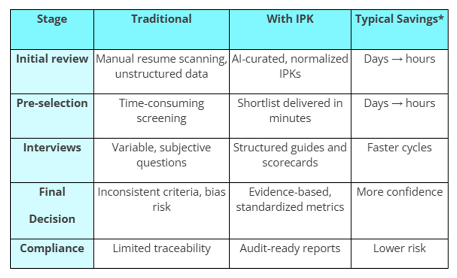 The IPK adds AI insights, evidence (interview clips, tests, work samples), and 0–100 scorecards comparable by role. It summarizes “who they are, what they’ve done, why they fit,” and standardizes criteria to reach decisions faster.