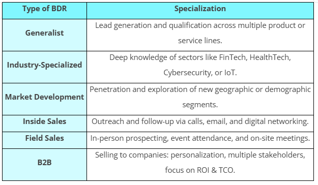 Beyond account size, BDRs can also be classified by how and where they operate. Understanding these specializations helps you design the right mix for your tech services sales team.